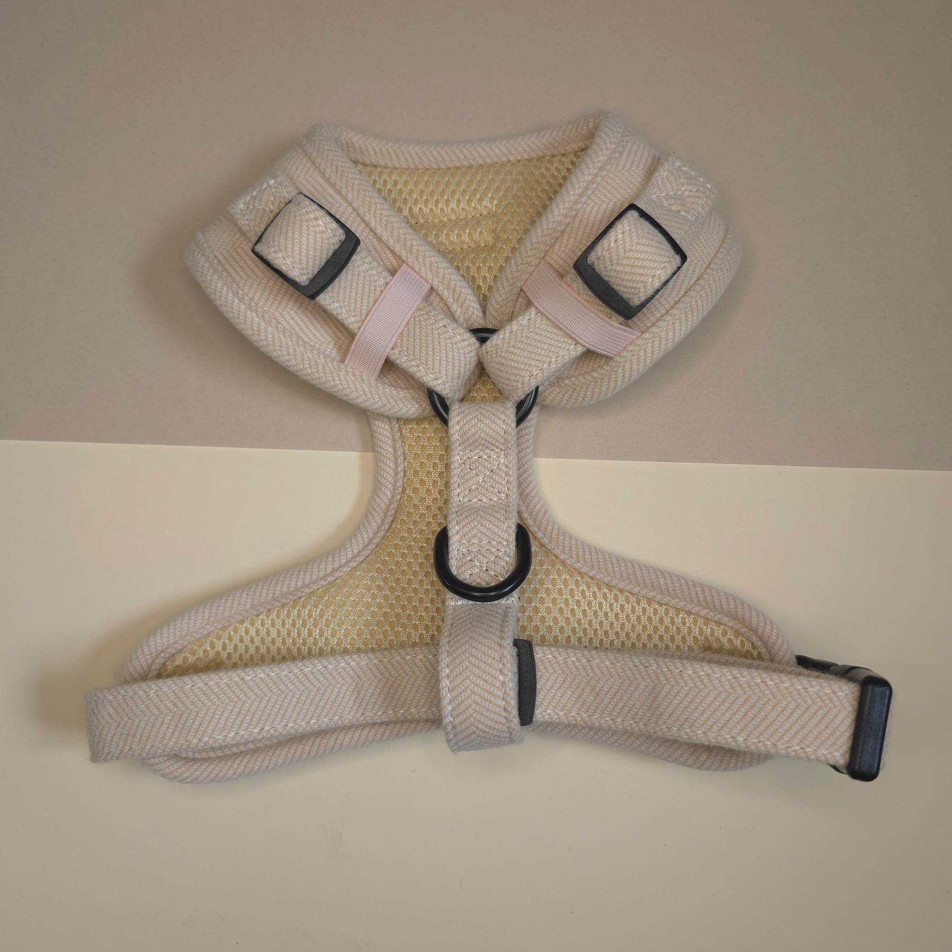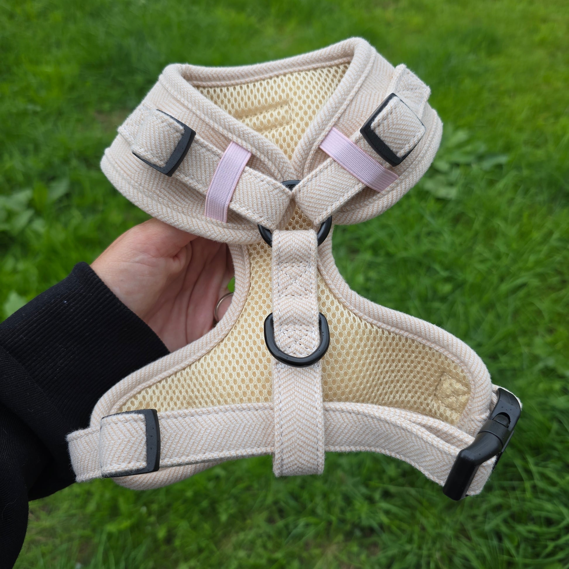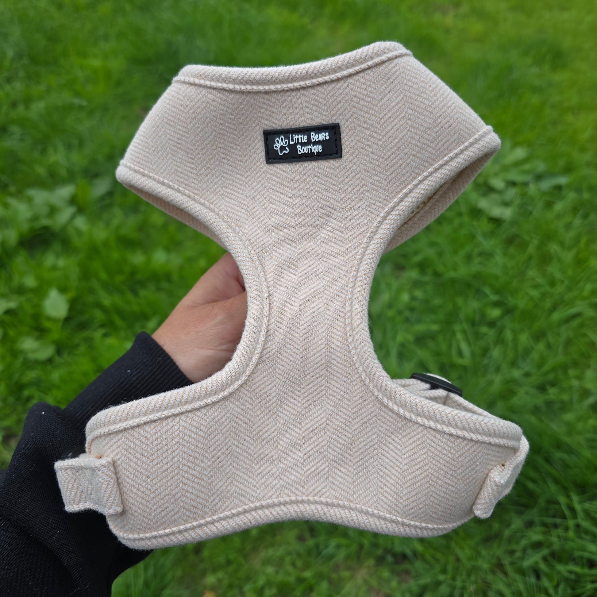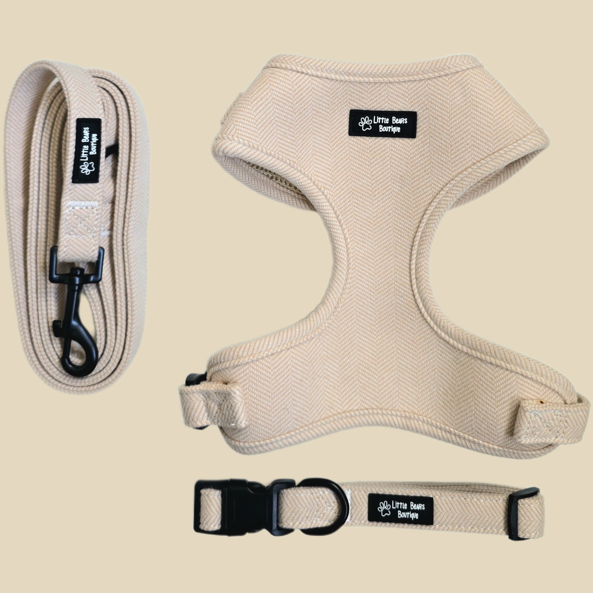 Elevate your pup’s wardrobe with the Beige Herringbone Tweed 3 piece Bundle. Featuring a beautifully coordinated harness, collar and lead, this timeless set pairs soft beige tones with a refined herringbone pattern for walks that feel as chic as they look.