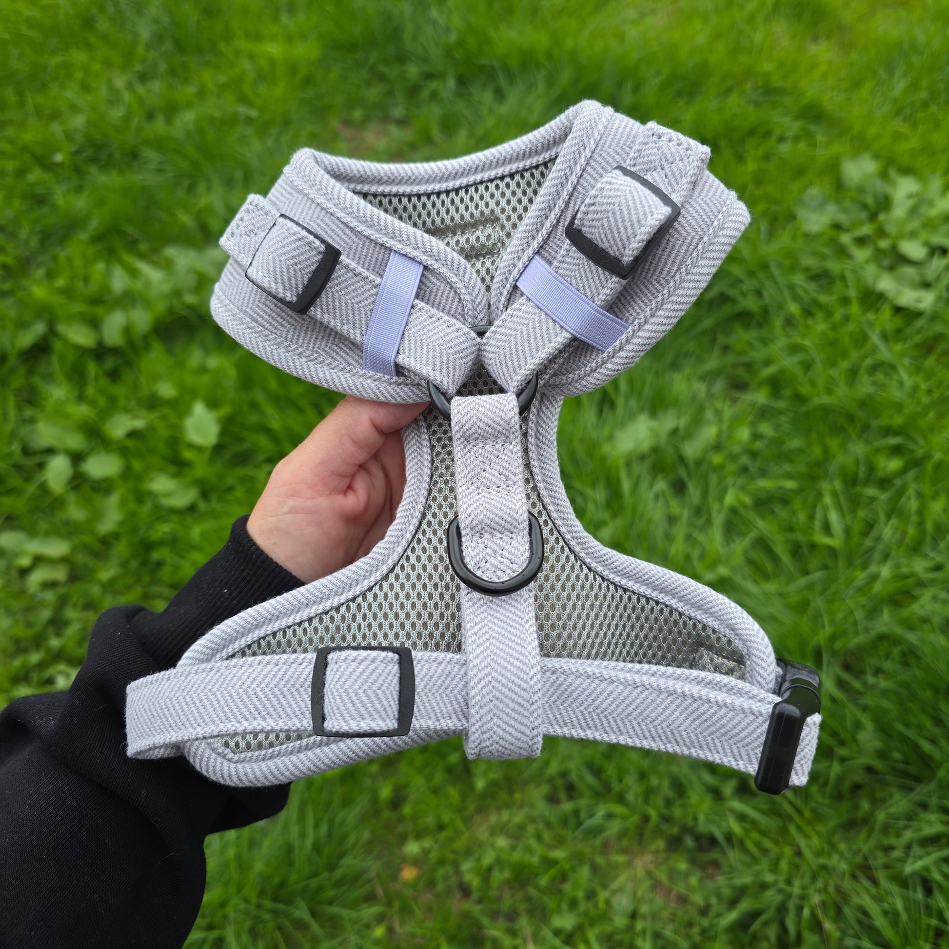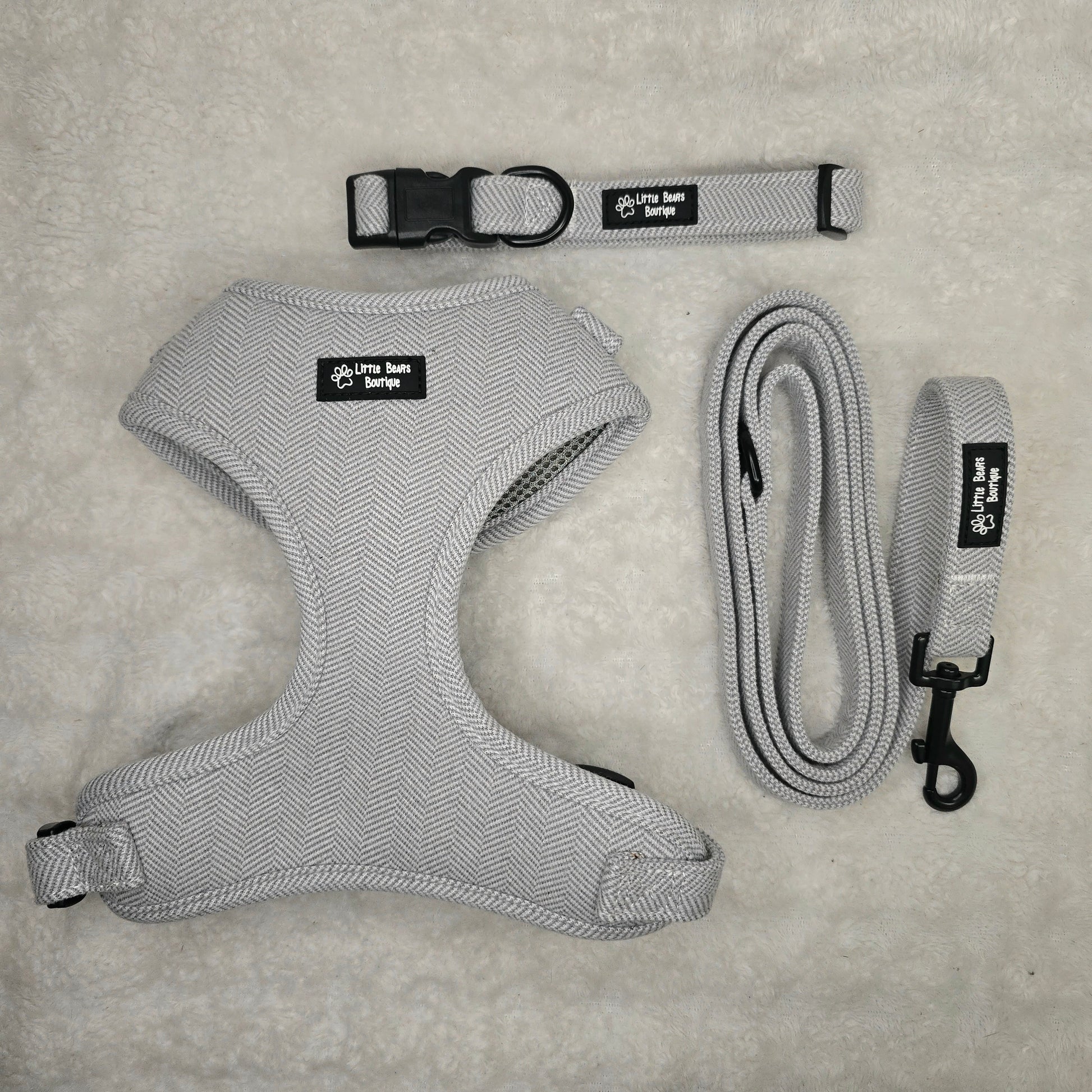 Elevate your pup’s wardrobe with the Grey Herringbone Tweed 3 piece Bundle. Featuring a beautifully coordinated harness, collar and lead, this timeless set pairs soft grey tones with a refined herringbone pattern for walks that feel as chic as they look.