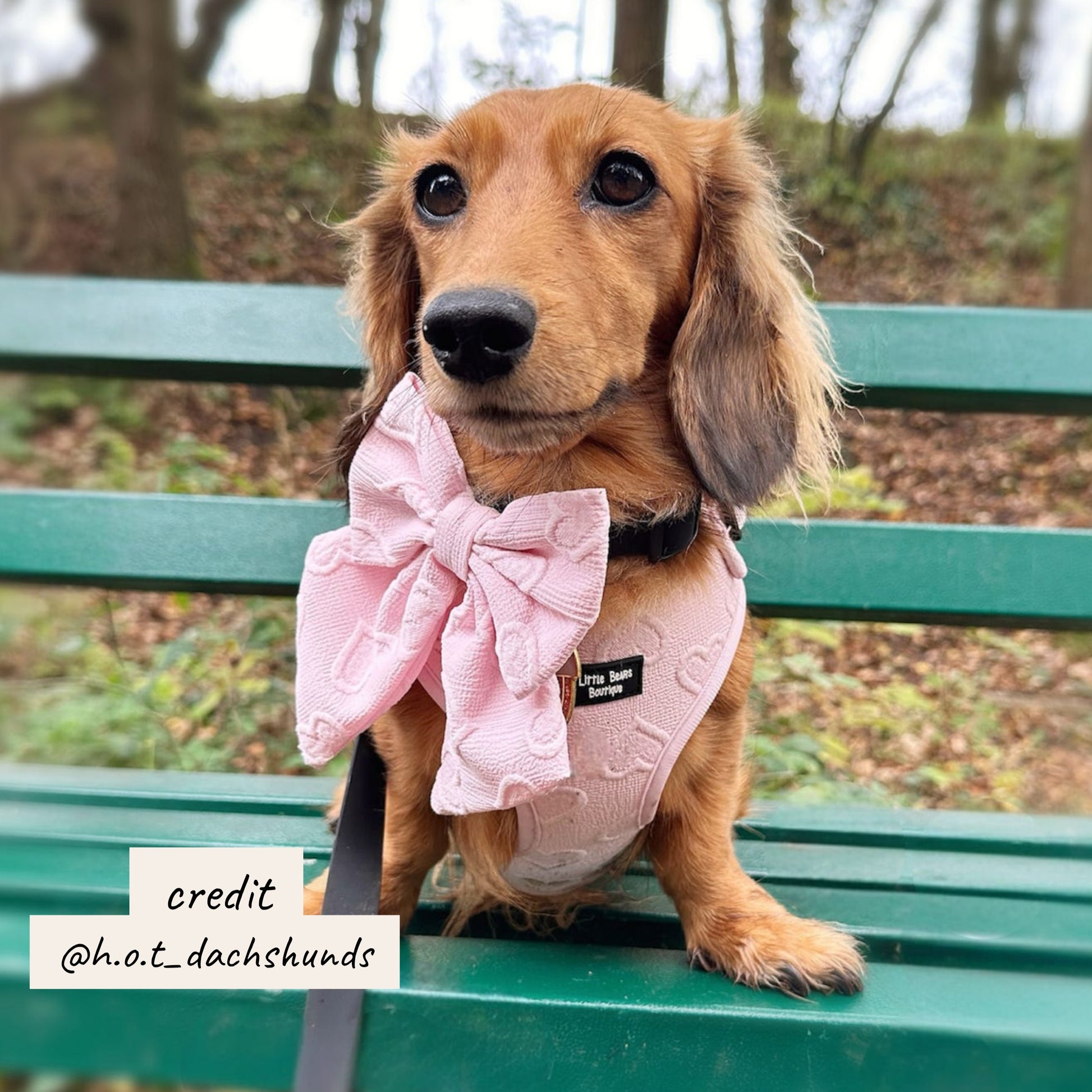Sweetheart Snuggles Bow — Pretty in Pink 💗 Turn heads with this pretty pink embroidered heart sailor bow tie. Designed for pups who aren’t afraid to stand out, it blends bold detail with playful charm. It's giving chic, sleek and everything in between 🎀
