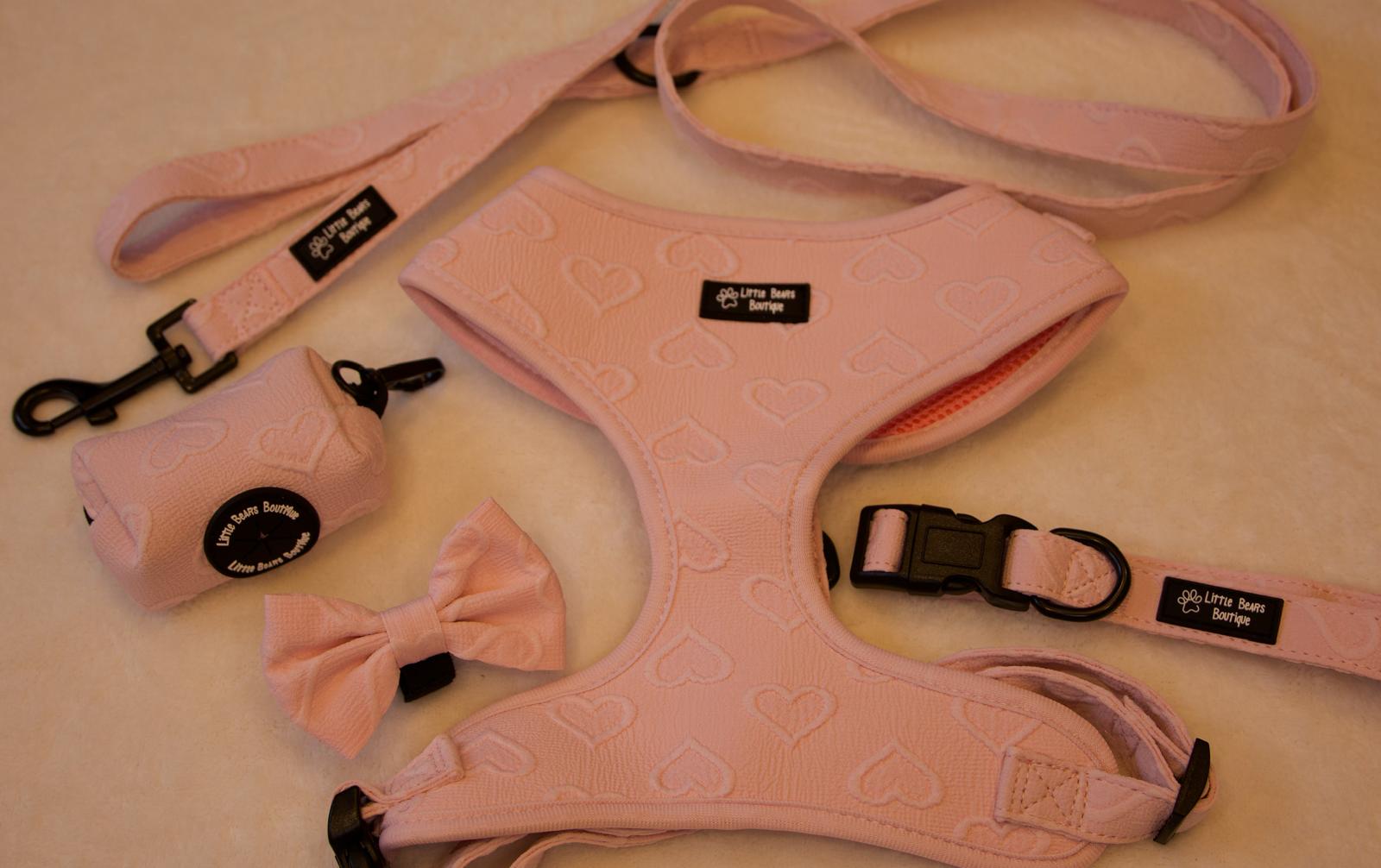 Elevate your pup’s wardrobe with the Sweetheart Snuggles 5 Piece Bundle. Featuring a beautifully coordinated harness, collar, and lead, bow tie and poop bag holder. This timeless set pairs pastel tones with an elegant embroidered pattern for walks that feel as chic as they look.